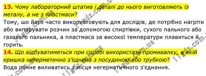 Чому лабораторний штатив і деталі до нього виготовляють із металу, а не з пластмаси? Тому, шо його часто використовують для дослідів, де потрібно нагріти або випарувати розчин за допомогою спиртівки, сухого пального або газового пальника, а пластмаса за високої температури плавиться й горить. 14. Що відбуватиметься при спробі використати промивалку, в якій кришка негерметично з’єднана з посудиною або трубкою? Вода почне виливатись з місця негерметичного з'єднання.