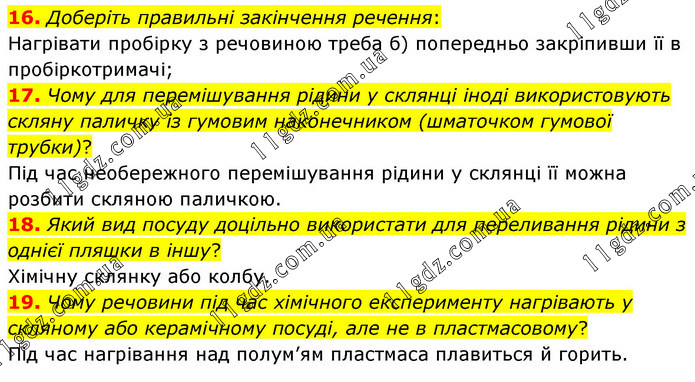 Доберіть правильні закінчення речення: Нагрівати пробірку з речовиною треба б) попередньо закріпивши її в пробіркотримачі; 17. Чому для перемішування рідини у склянці іноді використовують скляну паличку із гумовим наконечником (шматочком гумової трубки)? Під час необережного перемішування рідини у склянці її можна розбити скляною паличкою. 18. Який вид посуду доцільно використати для переливання рідини з однієї пляшки в іншу? Хімічну склянку або колбу. 19. Чому речовини під час хімічного експерименту нагрівають у скляному або керамічному посуді, але не в пластмасовому? Під час нагрівання над полум’ям пластмаса плавиться й горить.