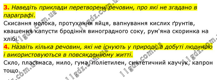 Наведіть приклади перетворень речовин, про які не згадано в параграфі. Скисання молока, протухання яйця, вапнування кислих ґрунтів, квашення капусти бродіння виноградного соку, рум'яна скоринка на хлібі. 4. Назвіть кілька речовин, які не існують у природі, а добуті людиною і використовуються в повсякденному житті. Скло, пластмаса, мило, гума, поліетилен, синтетичний каучук, капрон тощо.