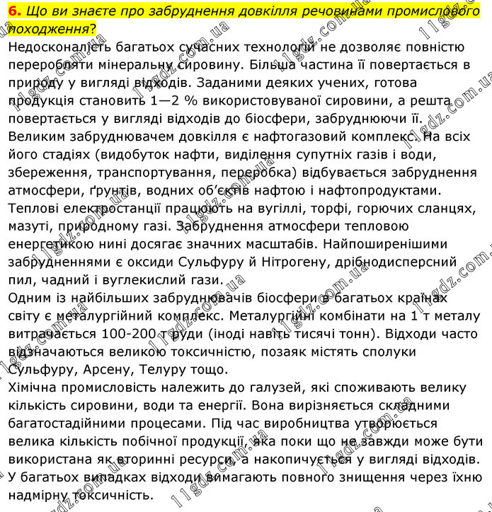 Що ви знаєте про забруднення довкілля речовинами промислового походження? Недосконалість багатьох сучасних технологій не дозволяє повністю переробляти мінеральну сировину. Більша частина її повертається в природу у вигляді відходів. Заданими деяких учених, готова продукція становить 1—2 % використовуваної сировини, а решта повертається у вигляді відходів до біосфери, забруднюючи її. Великим забруднювачем довкілля є нафтогазовий комплекс. На всіх його стадіях (видобуток нафти, виділення супутніх газів і води, збереження, транспортування, переробка) відбувається забруднення атмосфери, ґрунтів, водних об’єктів нафтою і нафтопродуктами. Теплові електростанції працюють на вугіллі, торфі, горючих сланцях, мазуті, природному газі. Забруднення атмосфери тепловою енергетикою нині досягає значних масштабів. Найпоширенішими забрудненнями є оксиди Сульфуру й Нітрогену, дрібнодисперсний пил, чадний і вуглекислий гази. Одним із найбільших забруднювачів біосфери в багатьох країнах світу є металургійний комплекс. Металургійні комбінати на 1 т металу витрачається 100-200 т руди (іноді навіть тисячі тонн). Відходи часто відзначаються великою токсичністю, позаяк містять сполуки Сульфуру, Арсену, Телуру тощо. Хімічна промисловість належить до галузей, які споживають велику кількість сировини, води та енергії. Вона вирізняється складними багатостадійними процесами. Під час виробництва утворюється велика кількість побічної продукції, яка поки що не завжди може бути використана як вторинні ресурси, а накопичується у вигляді відходів. У багатьох випадках відходи вимагають повного знищення через їхню надмірну токсичність.
