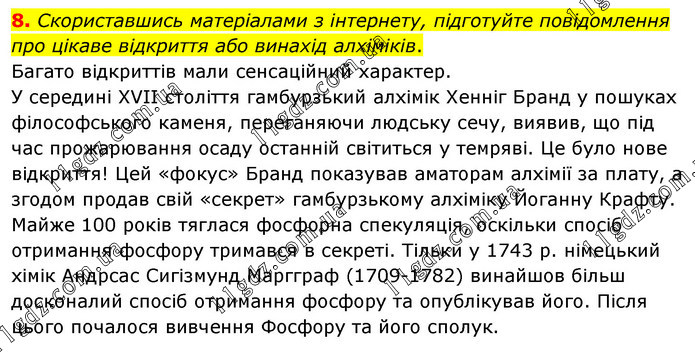 Скориставшись матеріалами з інтернету, підготуйте повідомлення про цікаве відкриття або винахід алхіміків. Багато відкриттів мали сенсаційний характер. У середині ХVII століття гамбурзький алхімік Хенніг Бранд у пошуках філософського каменя, переганяючи людську сечу, виявив, що під час прожарювання осаду останній світиться у темряві. Це було нове відкриття! Цей «фокус» Бранд показував аматорам алхімії за плату, а згодом продав свій «секрет» гамбурзькому алхіміку Йоганну Крафту. Майже 100 років тяглася фосфорна спекуляція, оскільки спосіб отримання фосфору тримався в секреті. Тільки у 1743 р. німецький хімік Андрсас Сигізмунд Маргграф (1709-1782) винайшов більш досконалий спосіб отримання фосфору та опублікував його. Після цього почалося вивчення Фосфору та його сполук.