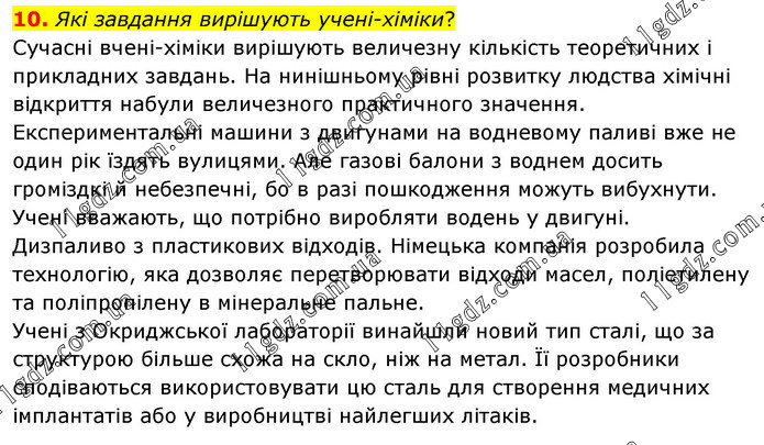Які завдання вирішують учені-хіміки? Сучасні вчені-хіміки вирішують величезну кількість теоретичних і прикладних завдань. На нинішньому рівні розвитку людства хімічні відкриття набули величезного практичного значення. Експериментальні машини з двигунами на водневому паливі вже не один рік їздять вулицями. Але газові балони з воднем досить громіздкі й небезпечні, бо в разі пошкодження можуть вибухнути. Учені вважають, що потрібно виробляти водень у двигуні. Дизпаливо з пластикових відходів. Німецька компанія розробила технологію, яка дозволяє перетворювати відходи масел, поліетилену та поліпропілену в мінеральне пальне. Учені з Окриджської лабораторії винайшли новий тип сталі, що за структурою більше схожа на скло, ніж на метал. Її розробники сподіваються використовувати цю сталь для створення медичних імплантатів або у виробництві найлегших літаків.