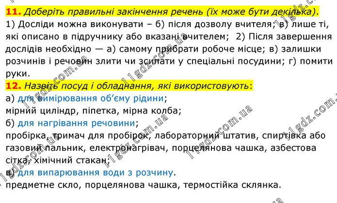 Доберіть правильні закінчення речень (їх може бути декілька). 1) Досліди можна виконувати – б) після дозволу вчителя; в) лише ті, які описано в підручнику або вказані вчителем; 2) Після завершення дослідів необхідно — а) самому прибрати робоче місце; в) залишки розчинів і речовин злити чи зсипати у спеціальні посудини; г) помити руки. 12. Назвіть посуд і обладнання, які використовують: а) для вимірювання об’єму рідини; мірний циліндр, піпетка, мірна колба; б) для нагрівання речовини; пробірка, тримач для пробірок, лабораторний штатив, спиртівка або газовий пальник, електронагрівач, порцелянова чашка, азбестова сітка, хімічний стакан; в) для випарювання води з розчину. предметне скло, порцелянова чашка, термостійка склянка.