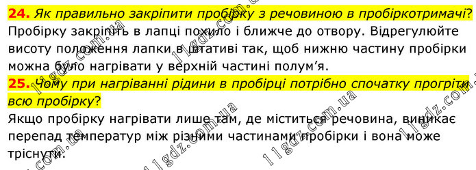 Як правильно закріпити пробірку з речовиною в пробіркотримачі? Пробірку закріпіть в лапці похило і ближче до отвору. Відрегулюйте висоту положення лапки в штативі так, щоб нижню частину пробірки можна було нагрівати у верхній частині полум’я. 25. Чому при нагріванні рідини в пробірці потрібно спочатку прогріти всю пробірку? Якщо пробірку нагрівати лише там, де міститься речовина, виникає перепад температур між різними частинами пробірки і вона може тріснути.
