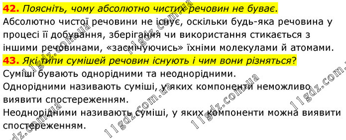 Поясніть, чому абсолютно чистих речовин не буває. Абсолютно чистої речовини не існує, оскільки будь-яка речовина у процесі її добування, зберігання чи використання стикається з іншими речовинами, «засмічуючись» їхніми молекулами й атомами. 43. Які типи сумішей речовин існують і чим вони різняться? Суміші бувають однорідними та неоднорідними. Однорідними називають суміші, у яких компоненти неможливо виявити спостереженням. Неоднорідними називають суміші, у яких компоненти можна виявити спостереженням.