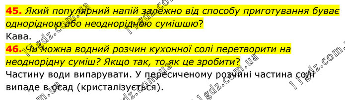 Який популярний напій залежно від способу приготування буває однорідною або неоднорідною сумішшю? Кава. 46. Чи можна водний розчин кухонної солі перетворити на неоднорідну суміш? Якщо так, то як це зробити? Частину води випарувати. У пересиченому розчині частина солі випаде в осад (кристалізується).