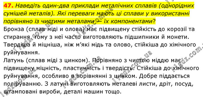 Наведіть один-два приклади металічних сплавів (однорідних сумішей металів). Які переваги мають ці сплави у використанні порівняно із чистими металами — їх компонентами? Бронза (сплав міді и олова) має підвищену стійкість до корозії та стирання, тому з неї часто виготовляють підшипники й монети. Твердіша й міцніша, ніж м’які мідь та олово, стійкіша до хімічного руйнування. Латунь (сплав міді з цинком). Порівняно з чистою міддю має підвищену міцність, пластичність і твердість. Стійкіша до хімічного руйнування, особливо в порівнянні з цинком. Добре піддається поліруванню. З латуні виготовляють металеві листи, дріт, посуд, штамповані вироби, деталі машин тощо.