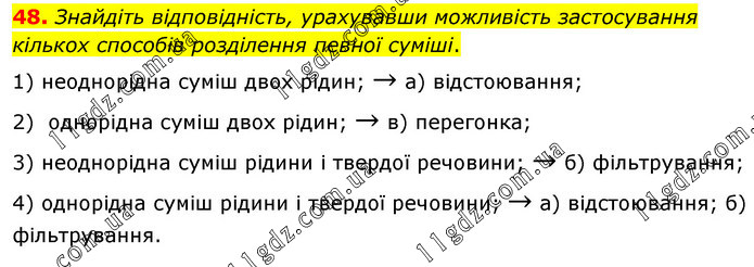 Знайдіть відповідність, урахувавши можливість застосування кількох способів розділення певної суміші. 1) неоднорідна суміш двох рідин; → а) відстоювання; 2) однорідна суміш двох рідин; → в) перегонка; 3) неоднорідна суміш рідини і твердої речовини; → б) фільтрування; 4) однорідна суміш рідини і твердої речовини; → а) відстоювання; б) фільтрування.
