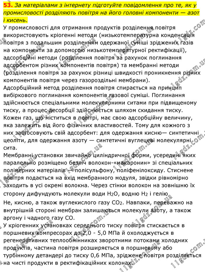 За матеріалами з інтернету підготуйте повідомлення про те, як у промисловості розділяють повітря на його головні компоненти — азот і кисень. У промисловості для отримання продуктів розділення повітря використовують кріогенні методи (низькотемпературна конденсація повітря з подальшим розділенням одержаної суміші зріджених газів на компоненти за допомогою низькотемпературної ректифікації), адсорбційні методи (розділення повітря за рахунок поглинання адсорбентом різних компонентів повітря) та мембранні методи (розділення повітря за рахунок різниці швидкості проникнення різних компонентів повітря через газороздільні мембрани). Адсорбційний метод розділення повітря спирається на принцип вибіркового поглинання компонентів газової суміші. Поглинання здійснюється спеціальними молекулярними ситами при підвищеному тиску, а процес десорбції здійснюється шляхом скидання тиску. Кожен газ, що міститься в повітрі, має свою адсорбційну величину, яка залежить від його фізичних властивостей. Тому для кожного з них застосовують свій адсорбент: для одержання кисню— синтетичні цеоліти, для одержання азоту — синтетичні вуглецеві молекулярні сита. Мембранні установки звичайно циліндричної форми, усередині яких паралельно розміщено безліч волокон-«макаронин» зі спеціальних полімерних матеріалів — полісульфону, поліфенілоксиду. Стиснене повітря подається на вхід мембранного модуля, звідки рівномірно заходить в усі окремі волокна. Через стінки волокон на зовнішню їх сторону дифундують молекули води Н2О, водню Н2 і гелію Не, кисню, а також вуглекислого газу СО2. Навпаки, переважно на внутрішній стороні мембран залишаються молекули азоту, а також аргону і чадного газу СО. У кріогенних установках середнього тиску повітря стискається в поршневих компресорах до 2,0 - 5,0 МПа й охолоджується в регенеративних теплообмінниках зворотними потоками холодних продуктів, частина повітря розширяється в поршневому або турбінному детандері до тиску 0,6 МПа, зріджене повітря розділяється на чисті продукти в ректифікаційних колонах.