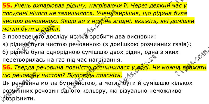 Учень випарював рідину, нагріваючи її. Через деякий час у посудині нічого не залишилося. Учень вирішив, що рідина була чистою речовиною. Якщо ви з ним не згодні, вкажіть, які домішки могли бути в рідині. З проведеного досліду можна зробити два висновки: а) рідина була чистою речовиною (з домішкою розчинних газів); б) рідина була однорідною сумішшю двох рідин, одна з яких перетворилась на газ під час нагрівання. 56. Тверда речовина повністю розчинилася у воді. Чи можна вважати цю речовину чистою? Відповідь поясніть. Ця речовина могла бути чистою, а могла бути й сумішшю кількох розчинних речовин одного кольору, які візуально неможливо розрізнити.