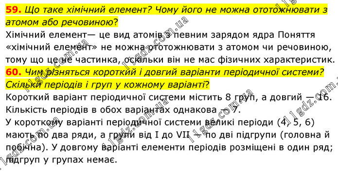 Що таке хімічний елемент? Чому його не можна ототожнювати з атомом або речовиною? Хімічний елемент— це вид атомів з певним зарядом ядра Поняття «хімічний елемент» не можна ототожнювати з атомом чи речовиною, тому що це не частинка, оскільки він не мас фізичних характеристик. 60. Чим різняться короткий і довгий варіанти періодичної системи? Скільки періодів і груп у кожному варіанті? Короткий варіант періодичної системи містить 8 груп, а довгий — 16. Кількість періодів в обох варіантах однакова — 7. У короткому варіанті періодичної системи великі періоди (4, 5, 6) мають по два ряди, а групи від І до VII — по дві підгрупи (головна й побічна). У довгому варіанті елементи періодів розміщені в один ряд; підгруп у групах немає.