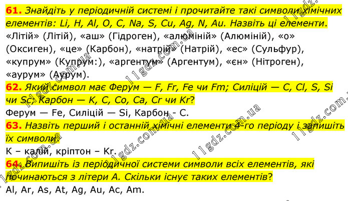 Знайдіть у періодичній системі і прочитайте такі символи хімічних елементів: Li, H, Al, O, C, Na, S, Cu, Ag, N, Au. Назвіть ці елементи. «Літій» (Літій), «аш» (Гідроген), «алюміній» (Алюміній), «о» (Оксиген), «це» (Карбон), «натрій» (Натрій), «ес» (Сульфур), «купрум» (Купрум:), «аргентум» (Аргентум), «єн» (Нітроген), «аурум» (Аурум). 62. Який символ має Ферум — F, Fr, Fe чи Fm; Силіцій — C, Cl, S, Si чи Sc; Карбон — K, C, Co, Ca, Cr чи Kr? Ферум — Fe, Силіцій — Si, Карбон - С. 63. Назвіть перший і останній хімічні елементи 4-го періоду і запишіть їх символи. К – калій, кріптон – Kr. 64. Випишіть із періодичної системи символи всіх елементів, які починаються з літери А. Скільки існує таких елементів? Al, Ar, As, At, Ag, Au, Ac, Am.