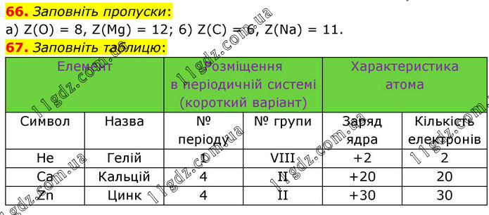 Заповніть пропуски: a) Z(О) = 8, Z(Mg) = 12; 6) Z(C) = 6, Z(Na) = 11. 67. Заповніть таблицю: