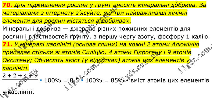 Для підживлення рослин у ґрунт вносять мінеральні добрива. За матеріалами з інтернету з’ясуйте, які три найважливіші хімічні елементи для рослин містяться в добривах. Мінеральні добрива — джерело різних поживних елементів для рослин і властивостей ґрунту, в першу чергу азоту, фосфору 1 калію. 71. У мінералі каолініті (основа глини) на кожні 2 атоми Алюмінію припадає стільки ж атомів Силіцію, 4 атоми Гідрогену і 9 атомів Оксигену; Обчисліть вміст (у відсотках) атомів цих елементів у каолініті. (2 + 2 + 4 + 9)/(2 ) ∙ 100% = 8,5 ∙ 100% = 85% - вміст атомів цих елементів у каолініті.