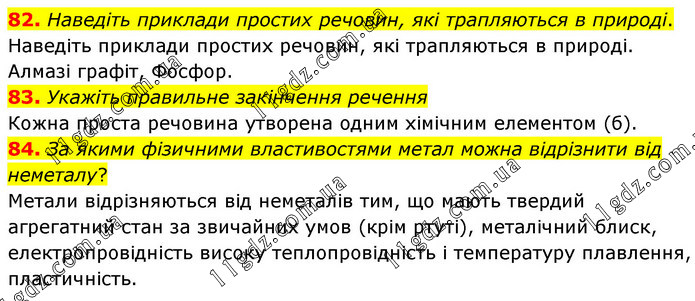 Наведіть приклади простих речовин, які трапляються в природі. Наведіть приклади простих речовин, які трапляються в природі. Алмазі графіт, Фосфор. 83. Укажіть правильне закінчення речення Кожна проста речовина утворена одним хімічним елементом (б). 84. За якими фізичними властивостями метал можна відрізнити від неметалу? Метали відрізняються від неметалів тим, що мають твердий агрегатний стан за звичайних умов (крім ртуті), металічний блиск, електропровідність високу теплопровідність і температуру плавлення, пластичність.