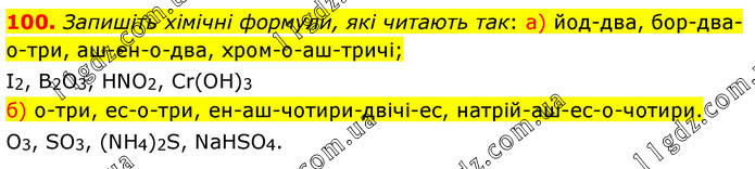 Запишіть хімічні формули, які читають так: а) йод-два, бор-два-о-три, аш-ен-о-два, хром-о-аш-тричі; I2, B2O3, HNO2, Cr(OH)3 б) о-три, ес-о-три, ен-аш-чотири-двічі-ес, натрій-аш-ес-о-чотири. О3, SO3, (NH4)2S, NaHSO4.