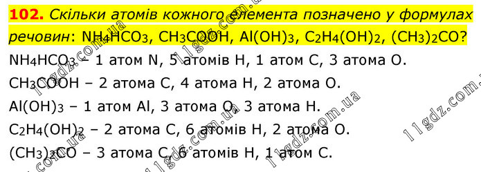 Скільки атомів кожного елемента позначено у формулах речовин: NH4НСО3, СН3СООН, Аl(ОН)3, С2Н4(ОН)2, (СН3)2СО? NН4НСО3 – 1 атом N, 5 атомів Н, 1 атом С, 3 атома О. СН3СООН – 2 атома С, 4 атома Н, 2 атома О. Аl(ОН)3 – 1 атом Аl, 3 атома О, 3 атома Н. С2Н4(ОН)2 – 2 атома С, 6 атомів Н, 2 атома О. (СН3)2СО – 3 атома С, 6 атомів Н, 1 атом С.