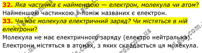 Яка частинка є найменшою — електрон, молекула чи атом? Найменшою частинкою з-поміж названих є електрон. 33. Чи має молекула електричний заряд? Чи містяться в ній електрони? Молекула не має електричного заряду (електро нейтральна). Електрони містяться в атомах, з яких складається ця молекула.
