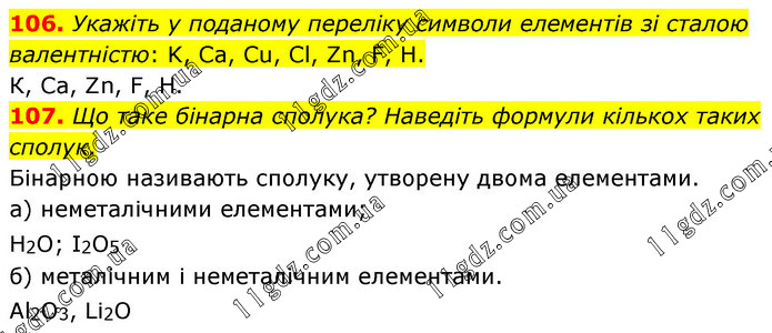 Укажіть у поданому переліку символи елементів зі сталою валентністю: K, Ca, Cu, Cl, Zn, F, H. К, Ca, Zn, F, H. 107. Що таке бінарна сполука? Наведіть формули кількох таких сполук. Бінарною називають сполуку, утворену двома елементами. а) неметалічними елементами; Н2О; І2О5 б) металічним і неметалічним елементами. Al2O3, Li2O