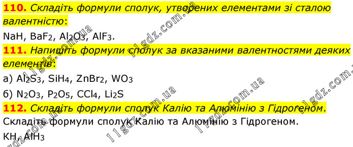 Складіть формули сполук, утворених елементами зі сталою валентністю: NaH, BaF2, Al2O3, AlF3. 111. Напишіть формули сполук за вказаними валентностями деяких елементів: а) Al2S3, SiH4, ZnBr2, WO3 б) N2O3, P2O5, ССl4, Li2S 112. Складіть формули сполук Калію та Алюмінію з Гідрогеном. Складіть формули сполук Калію та Алюмінію з Гідрогеном. КН, АlН3
