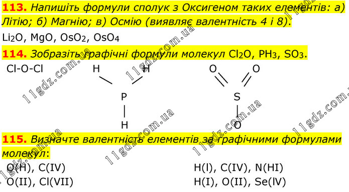 Напишіть формули сполук з Оксигеном таких елементів: а) Літію; б) Магнію; в) Осмію (виявляє валентність 4 і 8). Li2O, MgO, OsO2, OsO4 114. Зобразіть графічні формули молекул Cl2O, PH3, SO3. Визначте валентність елементів за графічними формулами молекул: O(H), C(IV) O(II), Cl(VII) H(l), C(IV), N(HI) H(I), O(II), Se(lV)