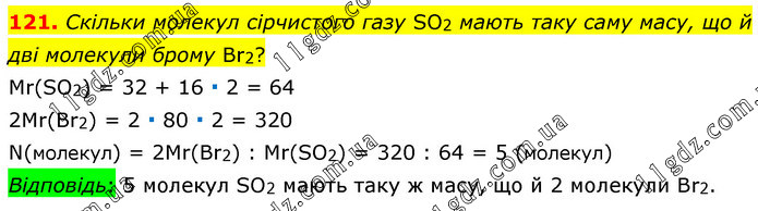 Скільки молекул сірчистого газу SO2 мають таку саму масу, що й дві молекули брому Br2? Mr(SO2) = 32 + 16 ∙ 2 = 64 2Мr(Вr2) = 2 ∙ 80 ∙ 2 = 320 N(молекул) = 2Мr(Вr2) : Мr(SO2) = 320 : 64 = 5 (молекул) Відповідь: 5 молекул SO2 мають таку ж масу, що й 2 молекули Вr2.