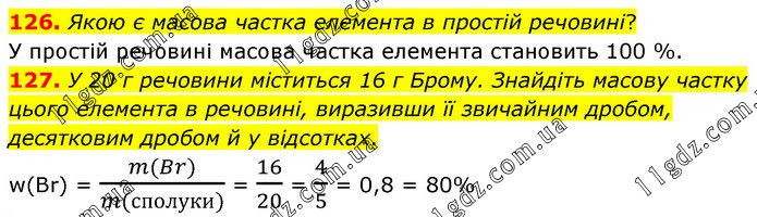 Якою є масова частка елемента в простій речовині? У простій речовині масова частка елемента становить 100 %. 127. У 20 г речовини міститься 16 г Брому. Знайдіть масову частку цього елемента в речовині, виразивши її звичайним дробом, десятковим дробом й у відсотках. w(Br) = (m(Br))/(m(сполуки)) = 16/20 = 4/5 = 0,8 = 80%