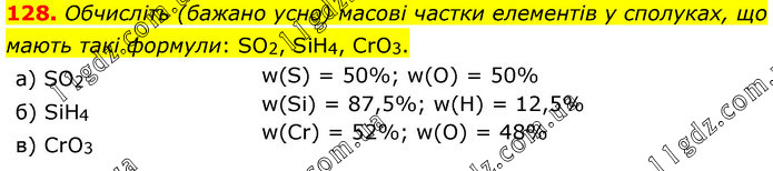 Обчисліть (бажано усно) масові частки елементів у сполуках, що мають такі формули: SO2, SiH4, CrO3. а) SO2 б) SiH4 в) CrO3 w(S) = 50%; w(O) = 50% w(Si) = 87,5%; w(H) = 12,5% w(Cr) = 52%; w(O) = 48%
