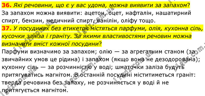 Які речовини, що є у вас удома, можна виявити за запахом? За запахом можна виявити: ацетон, оцет, нафталін, нашатирний спирт, бензин, медичний спирт, ванілін, оліфу тощо. 37. У посудинах без етикеток містяться парфуми, олія, кухонна сіль, кусочки заліза і граніту. За якими властивостями речовин можна визначити вміст кожної посудини? Парфуми визначимо за запахом; олію — за агрегатним станом (за звичайних умов це рідина) і запахом (якщо вона не дезодорована); кухонну сіль — за розчинністю у воді; шматочки заліза будуть притягуватись магнітом. В останній посудині міститиметься граніт: тверда речовина без запаху, не розчиняється у воді й не притягується магнітом.