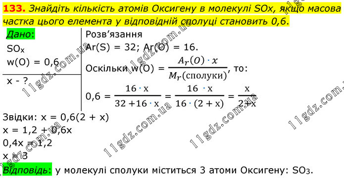 Знайдіть кількість атомів Оксигену в молекулі SOx, якщо масова частка цього елемента у відповідній сполуці становить 0,6. Розв’язання Ar(S) = 32; Ar(O) = 16. Оскільки w(O) = (A_r (O) ∙ x)/(M_r (сполуки)), то: 0,6 = (16 ∙ х )/(32 +16 ∙ х ) = (16 ∙ х)/(16 ∙ (2 + х)) = х/(2+х) Звідки: х = 0,6(2 + х) х = 1,2 + 0,6х 0,4х = 1,2 х = 3 Відповідь: у молекулі сполуки міститься 3 атоми Оксигену: SO3.