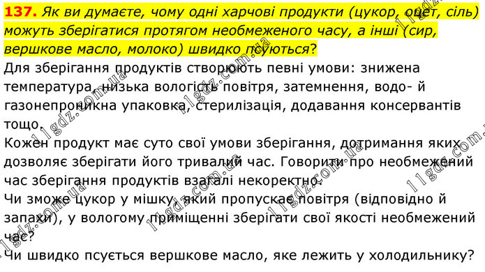 Як ви думаєте, чому одні харчові продукти (цукор, оцет, сіль) можуть зберігатися протягом необмеженого часу, а інші (сир, вершкове масло, молоко) швидко псуються? Для зберігання продуктів створюють певні умови: знижена температура, низька вологість повітря, затемнення, водо- й газонепроникна упаковка, стерилізація, додавання консервантів тощо. Кожен продукт має суто свої умови зберігання, дотримання яких дозволяє зберігати його тривалий час. Говорити про необмежений час зберігання продуктів взагалі некоректно. Чи зможе цукор у мішку, який пропускає повітря (відповідно й запахи), у вологому приміщенні зберігати свої якості необмежений час? Чи швидко псується вершкове масло, яке лежить у холодильнику?