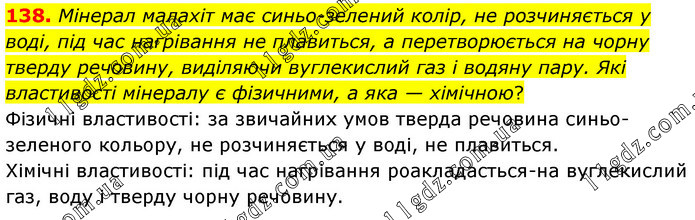 Мінерал малахіт має синьо-зелений колір, не розчиняється у воді, під час нагрівання не плавиться, а перетворюється на чорну тверду речовину, виділяючи вуглекислий газ і водяну пару. Які властивості мінералу є фізичними, а яка — хімічною? Фізичні властивості: за звичайних умов тверда речовина синьо-зеленого кольору, не розчиняється у воді, не плавиться. Хімічні властивості: під час нагрівання роакладасться-на вуглекислий газ, воду і тверду чорну речовину.