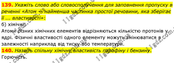 Укажіть слово або словосполучення для заповнення пропуску в реченні «Атом — найменша частинка простої речовини, яка зберігає її ... властивості»: б) хімічні; Атоми різних хімічних елементів відрізняються кількістю протонів у ядрі. Фізичні властивості одного елементу можуть змінюватися в залежності наприклад від тиску або температури. 140. Назвіть спільну хімічну властивість парафіну і бензину. Горючість.