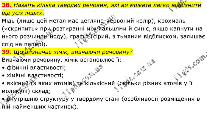Назвіть кілька твердих речовин, які ви можете легко відрізнити від усіх інших. Мідь (лише цей метал має цегляно-червоний колір), крохмаль («скрипить» при розтиранні між пальцями й синіє, якщо капнути на нього розчином йоду), графіт (сірий, з тьмяним відблиском, залишає слід на папері). 39. Що визначає хімік, вивчаючи речовину? Вивчаючи речовину, хімік встановлює її: • фізичні властивості; • хімічні властивості; • якісний (з яких атомів) та кількісний (скільки різних атомів у її молекулі) склад; • внутрішню структуру у твердому стані (особливості розміщення в ній найменших частинок).