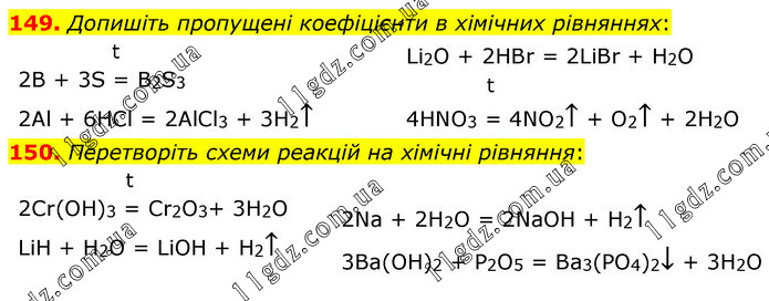 Допишіть пропущені коефіцієнти в хімічних рівняннях: t 2B + 3S = B2S3 2Al + 6HCl = 2AlCl3 + 3H2↑ Li2O + 2HBr = 2LiBr + H2O t 4HNO3 = 4NO2↑ + O2↑ + 2H2O 150. Перетворіть схеми реакцій на хімічні рівняння: t 2Cr(OH)3 = Cr2O3+ 3H2O LiH + H2O = LiOH + H2↑ 2Na + 2H2O = 2NaOH + H2↑ 3Ba(OH)2 + P2O5 = Ba3(PO4)2↓ + 3H2O