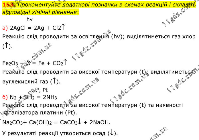 Прокоментуйте додаткові позначки в схемах реакцій і складіть відповідні хімічні рівняння: hv а) 2АgСl = 2Аg + Сl2↑ Реакцію слід проводити за освітлення (hv); виділятиметься газ хлор (↑). t Fе2O3 + С = Fe + CO2↑ Реакцію слід проводити за високої температури (t); виділятиметься вуглекислий газ (↑). t°, Pt б) N2 + ЗН2 = 2NН3 Реакцію слід проводити за високої температури (t) та наявності каталізатора платини (Pt). Na2CO3+ Са(ОН)2 = СаСO3↓ + 2NaOH. У результаті реакції утвориться осад (↓).