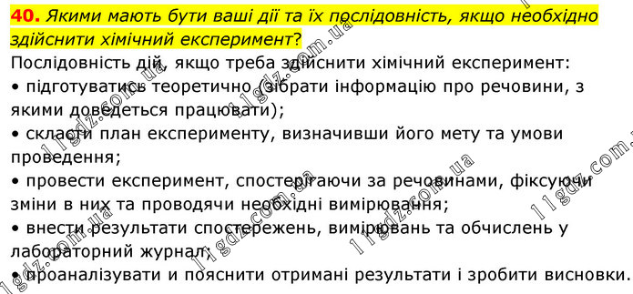 Якими мають бути ваші дії та їх послідовність, якщо необхідно здійснити хімічний експеримент? Послідовність дій, якщо треба здійснити хімічний експеримент: • підготуватись теоретично (зібрати інформацію про речовини, з якими доведеться працювати); • скласти план експерименту, визначивши його мету та умови проведення; • провести експеримент, спостерігаючи за речовинами, фіксуючи зміни в них та проводячи необхідні вимірювання; • внести результати спостережень, вимірювань та обчислень у лабораторний журнал; • проаналізувати и пояснити отримані результати і зробити висновки.