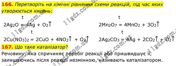 Перетворіть на хімічні рівняння схеми реакцій, під час яких утворюється кисень: t 2Ag2O = 4Ag + O2↑ t 2Cu(NO3)2 = 2CuO + 4NO2↑ + O2↑ t 2Mn2O7 = 4MnO2 + 3O2↑ t 2Ag2CO3 = 4Ag + 2CO2↑ + O2↑ 167. Що таке каталізатор? Речовину, яка спричиняє перебіг реакції або пришвидшує її, залишаючись після реакції незмінною, називають каталізатором.