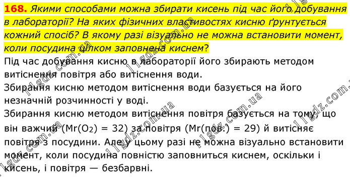 Якими способами можна збирати кисень під час його добування в лабораторії? На яких фізичних властивостях кисню ґрунтується кожний спосіб? В якому разі візуально не можна встановити момент, коли посудина цілком заповнена киснем? Під час добування кисню в лабораторії його збирають методом витіснення повітря або витіснення води. Збирання кисню методом витіснення води базується на його незначній розчинності у воді. Збирання кисню методом витіснення повітря базується на тому, що він важчий (Мr(O2) = 32) за повітря (Мr(пов.) = 29) й витісняє повітря з посудини. Але у цьому разі не можна візуально встановити момент, коли посудина повністю заповниться киснем, оскільки і кисень, і повітря — безбарвні.