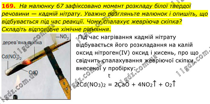 На малюнку 67 зафіксовано момент розкладу білої твердої речовини — кадмій нітрату. Уважно розгляньте малюнок і опишіть, що відбувається під час реакції. Чому спалахує жевріюча скіпка? Складіть відповідне хімічне рівняння. Під час нагрівання кадмій нітрату відбувається його розкладання на калій оксид нітроген(ІV) оксид і кисень, про що свідчить спалахування жевріючої скіпки, внесеної у пробірку: t 2Cd(NO3)2 = 2CaO + 4NO2↑ + O2↑