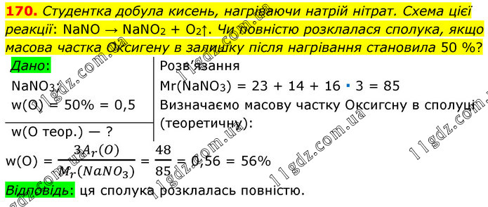 Студентка добула кисень, нагріваючи натрій нітрат. Схема цієї реакції: NaNO → NaNO2 + O2↑. Чи повністю розклалася сполука, якщо масова частка Оксигену в залишку після нагрівання становила 50 %? Розв’язання Мr(NаNО3) = 23 + 14 + 16 ∙ 3 = 85 Визначаємо масову частку Оксигсну в сполуці (теоретичну): w(O) = (3A_r (O))/(M_r (NaNO_3)) = 48/85 = 0,56 = 56% Відповідь: ця сполука розклалась повністю.