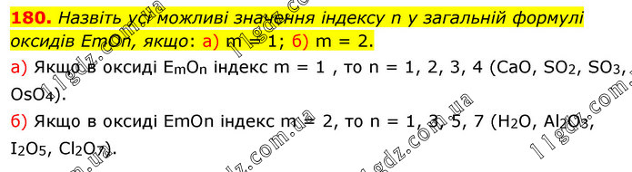 Назвіть усі можливі значення індексу n у загальній формулі оксидів ЕmОn, якщо: а) m = 1; б) m = 2. а) Якщо в оксиді EmOn індекс m = 1 , то n = 1, 2, 3, 4 (CaO, SO2, SO3, OsO4). б) Якщо в оксиді EmOn індекс m = 2, то n = 1, 3, 5, 7 (Н2О, Al2O3, I2О5, Сl2О7).