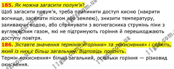 Як можна загасити полум’я? Щоб загасити полум’я, треба припинити доступ кисню (накрити вогнище, засипати піском або землею), знизити температуру, заливаючи водою, або спрямувати з вогнегасника струмінь піни з вуглекислим газом, які не підтримують горіння й перешкоджають доступу повітря. 186. Зіставте значення термінів «горіння» та «окиснення» і скажіть, який із них є більш загальним. Відповідь поясніть. Термін «окиснення» більш загальний, оскільки горіння — різновид окиснення.