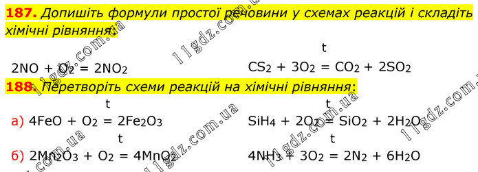 Допишіть формули простої речовини у схемах реакцій і складіть хімічні рівняння: 2NO + O2 = 2NO2 t CS2 + 3O2 = CO2 + 2SO2 188. Перетворіть схеми реакцій на хімічні рівняння: t а) 4FeO + O2 = 2Fe2O3 t б) 2Mn2O3 + O2 = 4MnO2 t SiH4 + 2O2 = SiO2 + 2H2O t 4NH3 + 3O2 = 2N2 + 6H2O