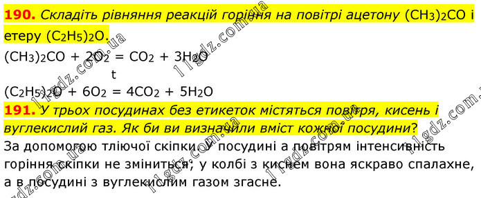 Складіть рівняння реакцій горіння на повітрі ацетону (СН3)2СО і етеру (С2Н5)2О. (CH3)2CO + 2O2 = CO2 + 3H2O t (C2H5)2O + 6O2 = 4CO2 + 5H2O 191. У трьох посудинах без етикеток містяться повітря, кисень і вуглекислий газ. Як би ви визначили вміст кожної посудини? За допомогою тліючої скіпки. У посудині а повітрям інтенсивність горіння скіпки не зміниться; у колбі з киснем вона яскраво спалахне, а в посудині з вуглекислим газом згасне.