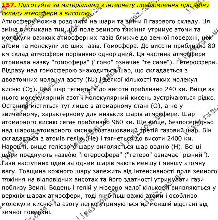 Підготуйте за матеріалами з інтернету повідомлення про зміну складу атмосфери з висотою. Атмосферу можна розділити на шари та зміни її газового складу. Ця зміна викликана тим, що поле земного тяжіння утримує атоми та молекули важких атмосферних газів ближче до земної поверхні, ніж атоми та молекули легших газів. Гомосфера. До висоти приблизно 80 км склад атмосфери порівняно однорідний. Ця частина атмосфери отримала назву "гомосфера" ("гомо" означає "те саме"). Гетеросфера. Відразу над гомосферою знаходиться шар, що складається з двоатомних молекул азоту (N2) і деякої кількості таких молекул кисню (О2). Цей шар тягнеться до висоти приблизно 240 км. Вище за нього молекулярний азот і молекулярний кисень зустрічаються рідко. Останній міститься тут лише в атомарному стані (О), а не у звичайному, характерному для низьких шарів атмосфери. Шар атомарного кисню сягає приблизно 960 км. Ще вище, безпосередньо над шаром атомарного кисню розташований третій газовий шар. Він складається з атомів гелію (Не) і тягнеться до висоти 2400 км. Нарешті, вище гелієвого шару виявляється шар водню (Н). Всі ці шари поєднують назвою "гетеросфера" ("гетеро" означає "різний"). Гази наступних один за одним шарів мають меншу і меншу атомну вагу. Товщина кожного шару залежить від інтенсивності поля земного тяжіння на відповідних висотах та його здатності утримувати гази поблизу Землі. Водень і гелій у мізерно малої кількості виявляються у верхніх шарах атмосфери, тоді як більш важкі атоми і особливо молекули кисню та азоту легко утримуються на меншій відстані від земної поверхні.