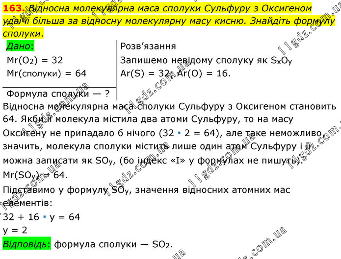 Відносна молекулярна маса сполуки Сульфуру з Оксигеном удвічі більша за відносну молекулярну масу кисню. Знайдіть формулу сполуки. Розв’язання Запишемо невідому сполуку як SхОу Аr(S) = 32; Аr(O) = 16. Відносна молекулярна маса сполуки Сульфуру з Оксигеном становить 64. Якби її молекула містила два атоми Сульфуру, то на масу Оксигену не припадало б нічого (32 ∙ 2 = 64), але таке неможливо, значить, молекула сполуки містить лише один атом Сульфуру і її можна записати як SОy, (бо індекс «І» у формулах не пишуть). Мr(SОy) = 64. Підставимо у формулу SОy, значення відносних атомних мас елементів: 32 + 16 ∙ y = 64 у = 2 Відповідь: формула сполуки — SО2.