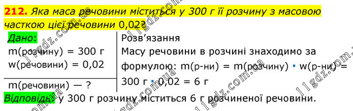 Яка маса речовини міститься у 300 г її розчину з масовою часткою цієї речовини 0,02? Розв’язання Масу речовини в розчині знаходимо за формулою: m(р-ни) = m(розчину) ∙ w(р-ни) = 300 г ∙ 0,02 = 6 г Відповідь: у 300 г розчину міститься 6 г розчиненої речовини.
