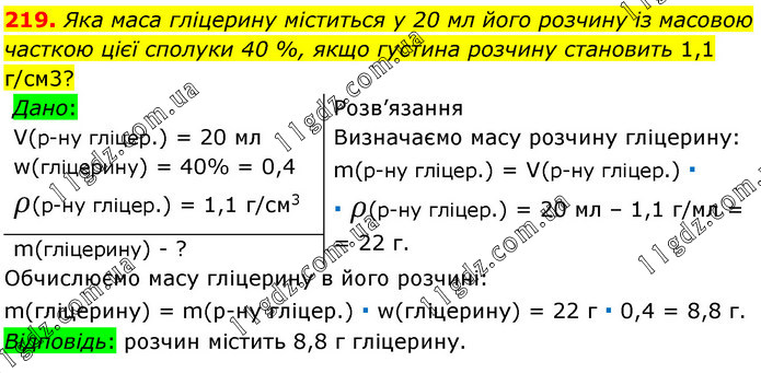 Яка маса гліцерину міститься у 20 мл його розчину із масовою часткою цієї сполуки 40 %, якщо густина розчину становить 1,1 г/см3? Розв’язання Визначаємо масу розчину гліцерину: m(р-ну гліцер.) = V(р-ну гліцер.) ∙ ∙ ρ(р-ну гліцер.) = 20 мл – 1,1 г/мл = 22 г. Обчислюємо масу гліцерину в його розчині: m(гліцерину) = m(р-ну гліцер.) ∙ w(гліцерину) = 22 г ∙ 0,4 = 8,8 г. Відповідь: розчин містить 8,8 г гліцерину.