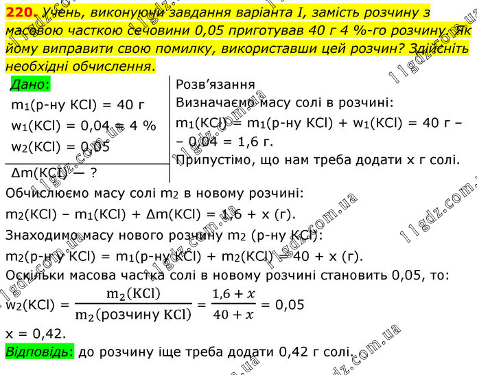 Учень, виконуючи завдання варіанта І, замість розчину з масовою часткою сечовини 0,05 приготував 40 г 4 %-го розчину. Як йому виправити свою помилку, використавши цей розчин? Здійсніть необхідні обчислення. Розв’язання Визначаємо масу солі в розчині: m1(КСl) = m1(р-ну КСl) + w1(КСl) = 40 г – 0,04 = 1,6 г. Припустімо, що нам треба додати x г солі. Обчислюємо масу солі m2 в новому розчині: m2(КСl) – m1(КСl) + ∆m(КСl) = 1,6 + x (г). Знаходимо масу нового розчину m2 (р-ну КСl): m2(р-н у КСl) = m1(р-ну КСl) + m2(КСl) = 40 + x (г). Оскільки масова частка солі в новому розчині становить 0,05, то: w2(KCl) = (m_2 (KCl))/(m_2 (розчину KCl) ) = (1,6 + x)/(40 + x) = 0,05 x = 0,42. Відповідь: до розчину іще треба додати 0,42 г солі.